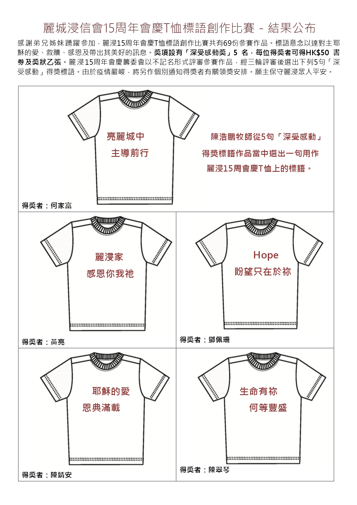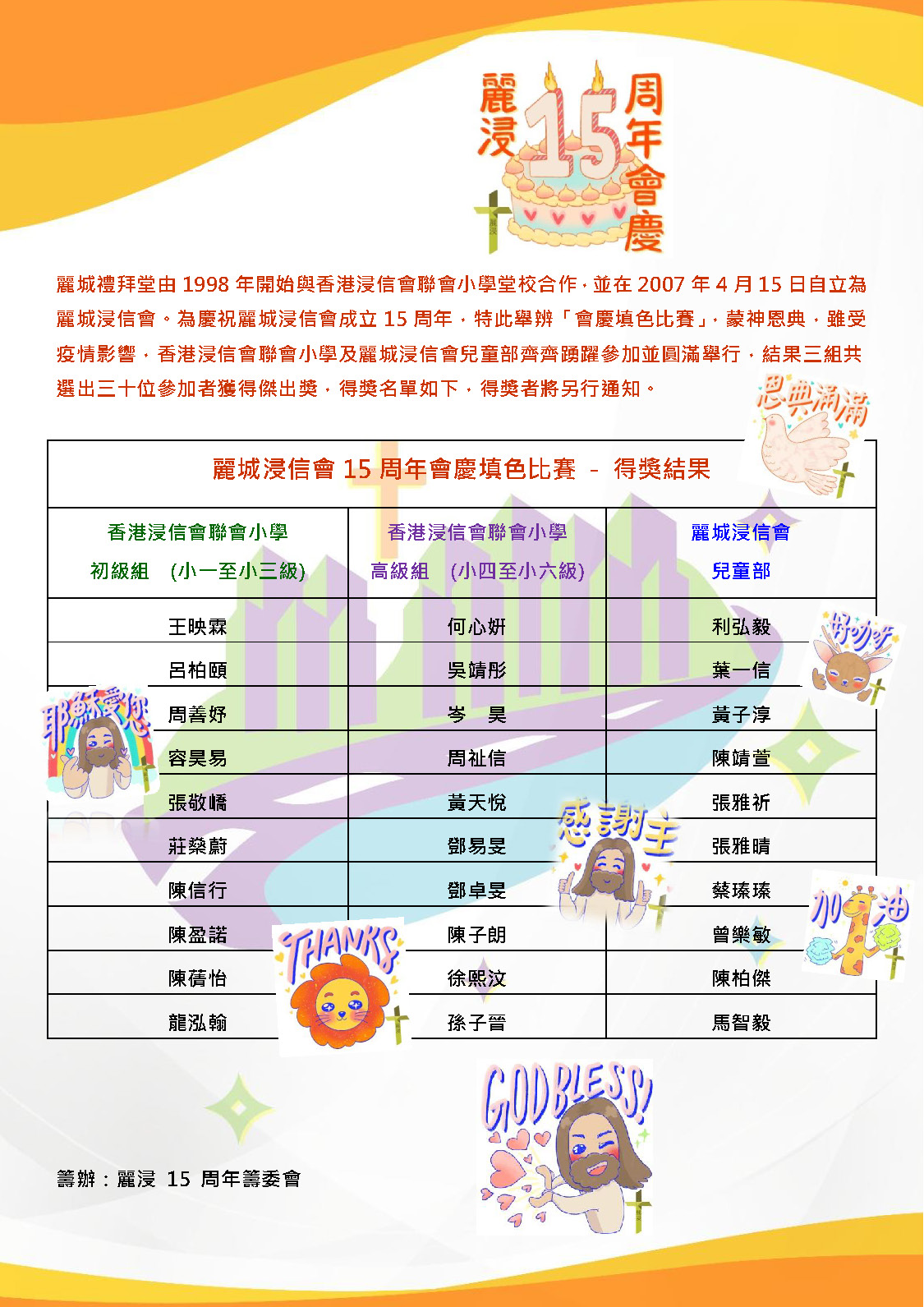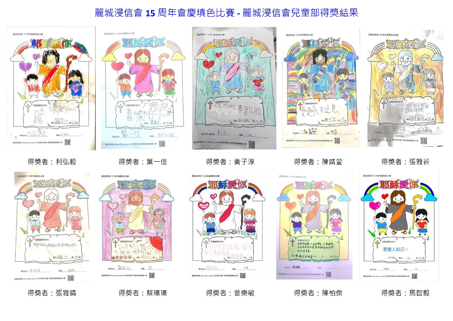 麗浸會慶填色比賽 已於 2022 年 4 月 15 日圓滿結束,再次感謝同學熱烈支持及 參與。 鑑於疫情持續關係,為顧及各人的健康和安全,亦須配合政府的防疫措 施, 本會將於本年 7 月透過學校及兒童部發信予個別得?者, 安排於 2022 年 8月 28 日福音主日午堂崇拜內出席領獎。
